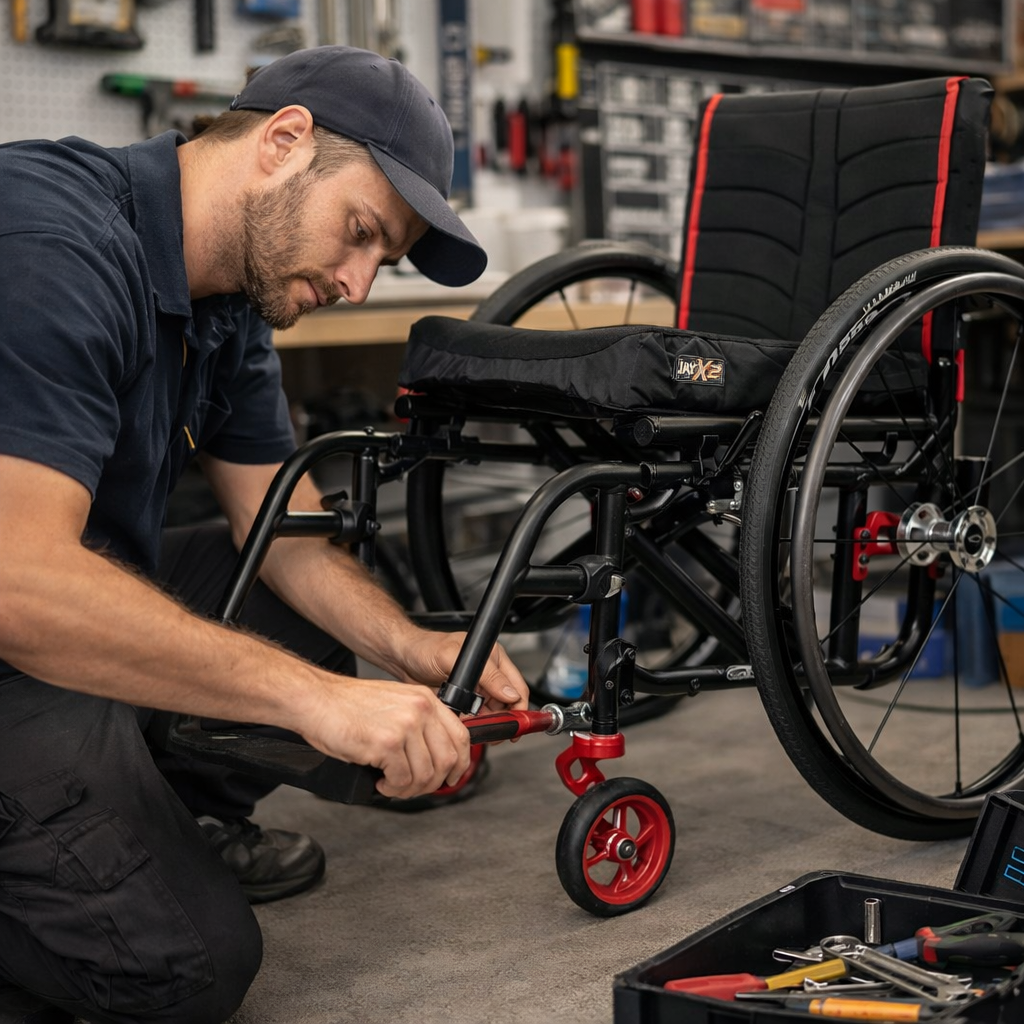 We service manual wheelchairs of all types and configurations. Repairs and maintenance services include, but are not limited to, flat tire repair and replacement, brake adjustment and tightening, caster and wheel replacement, bearing servicing, frame and hardware adjustments, and replacement of worn or damaged components. Our goal is to ensure your wheelchair remains safe, comfortable, and easy to operate.