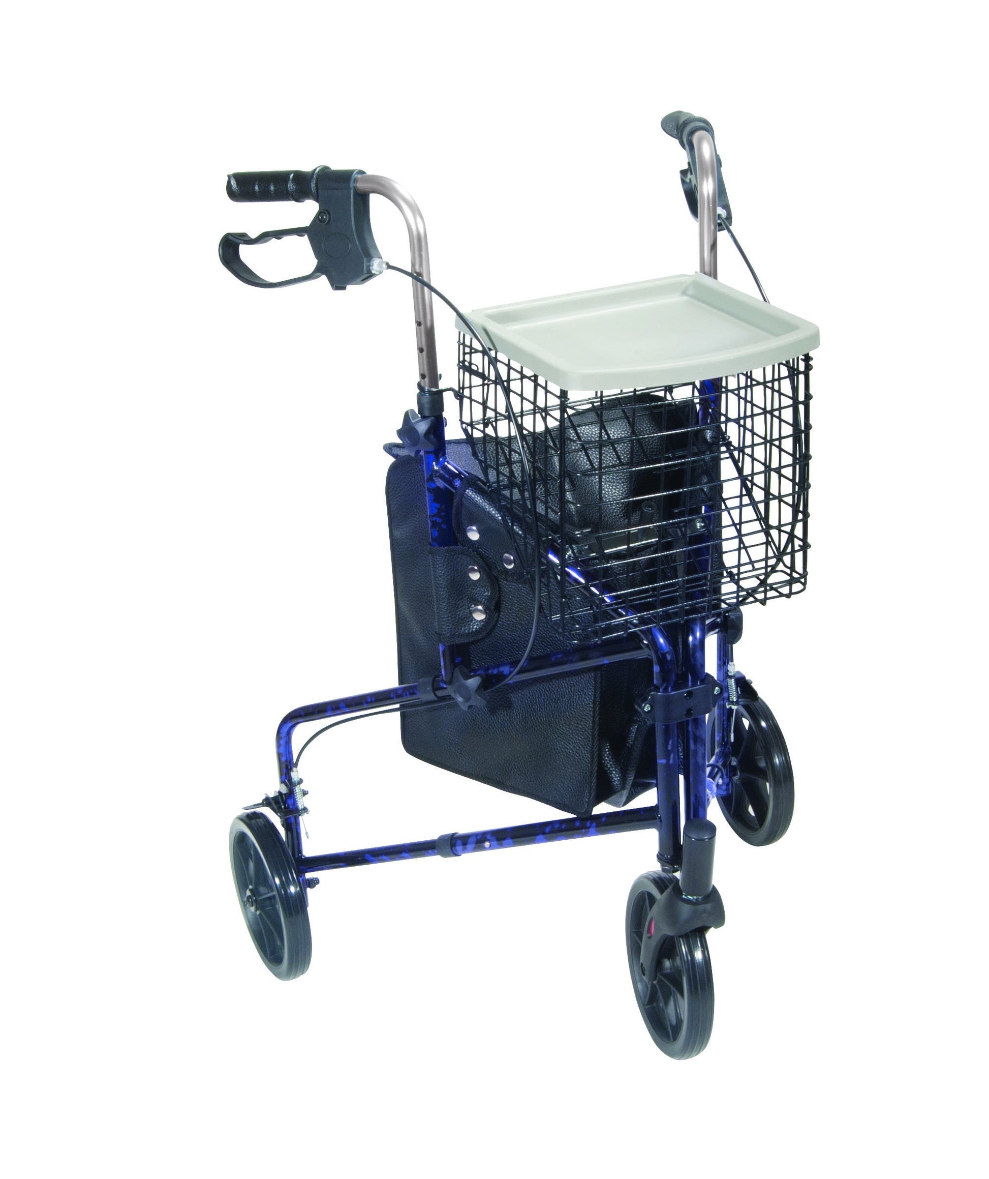 This 3 wheel rollator in blue has a lightweight aluminum frame and comes standard with basket, tray and pouch. Easy one hand folding makes for simple storage. Easy to adjust handle height with self-threading knob. Lightweight solid 8" wheels for indoor and outdoor use. Comes standard with special loop locks made of internal aluminum casting to ensure safety.