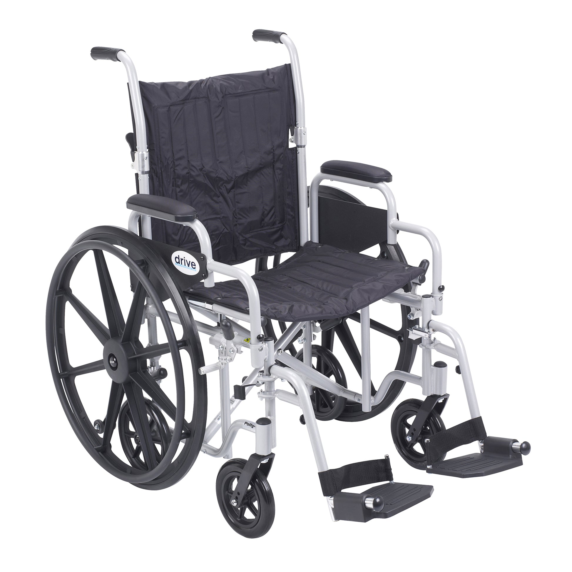 The 20" Poly-Fly High Strength Lightweight Wheelchair/Flyweight Transport Chair Combo by Drive Medical can be used as a standard, self propelled wheelchair or as a transport chair, all-in-one for your convenience. The quick release 24" wheels can be easily removed to transition from a wheelchair to a transport chair. Also comes with two sets of aluminum wheel locks, one for use with wheelchair and one for use with transport chair, for added safety. The deluxe back release folds down the backrest for easy and convenient storage and transportation. Comes standard with easy to clean nylon upholstery, swing away footrests, composite crack-proof footplates, heel loops and 8" caster wheels that provide a smooth ride over most surfaces.