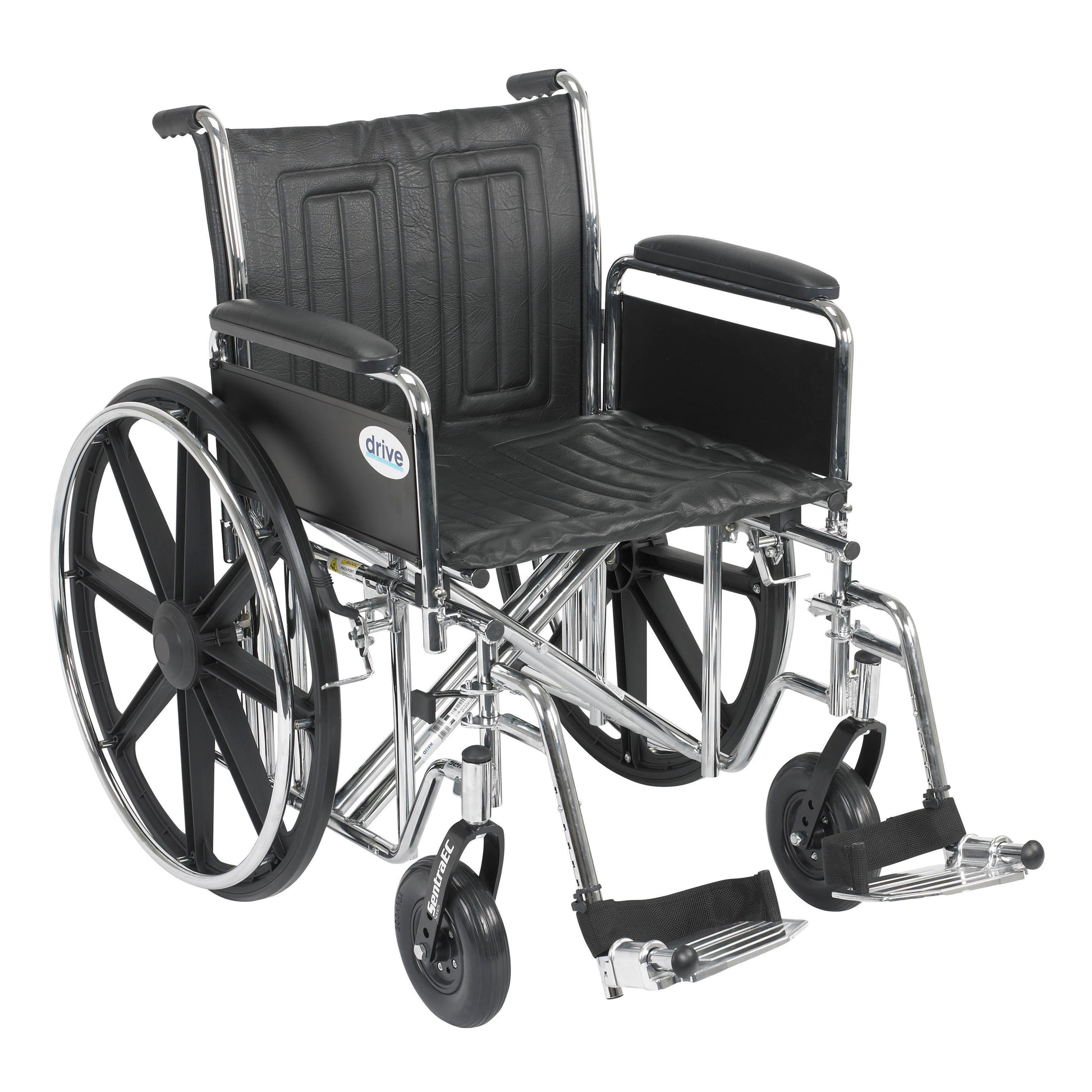 The Bariatric Sentra EC Heavy Duty Wheelchair with Detachable Full Arms and Swing Away Footrests by Drive Medical comes with a Dual Cross Bar that reinforces the carbon steel frame, making this chair capable of a 450 lbs. weight capacity. The carbon steel frame has an attractive, chip proof, maintainable, triple coated, chrome finish and double embossed, vinyl upholstery, making this bariatric wheelchair durable, lightweight, attractive and easy to clean. The standard, dual axle, conveniently provides an easy transition of seat to hemi-level. Comes standard with detachable full arms, swing away footrests, 8 front caster wheels, urethane tires, aluminum footplates, chrome hand rims, and push to lock wheel locks, ensuring user safety. 3 year warranty.